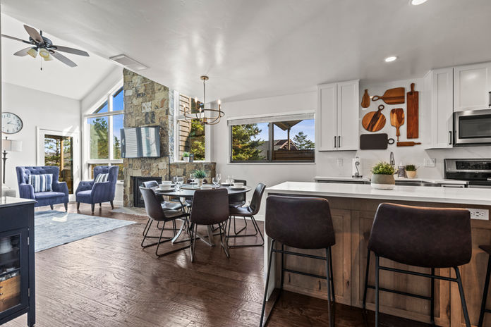 Main Level: Open kitchen, dining & living area with stone fireplace and mountain-chic décor